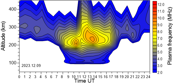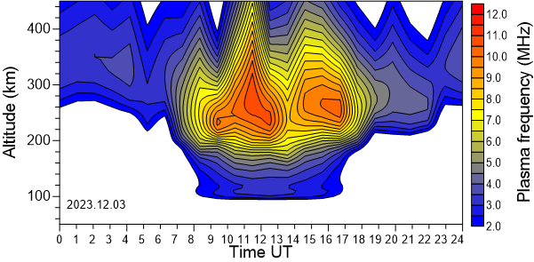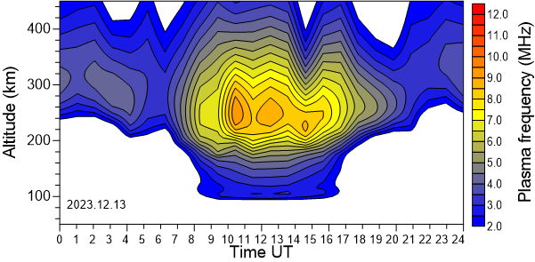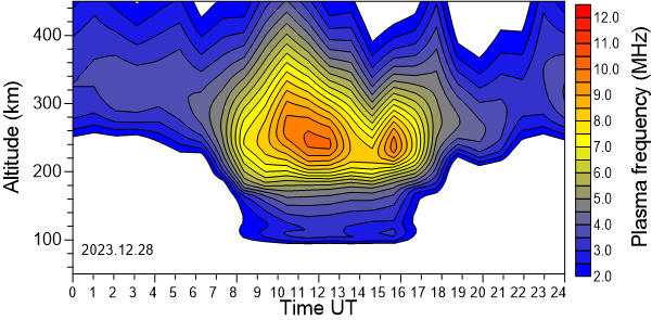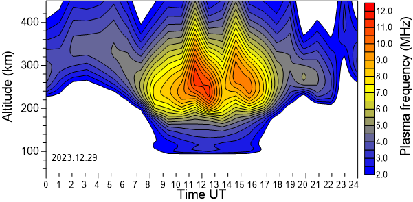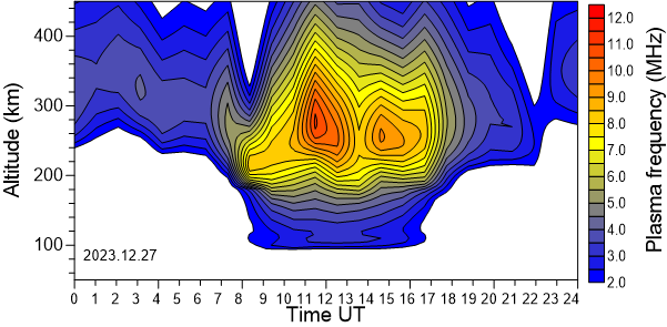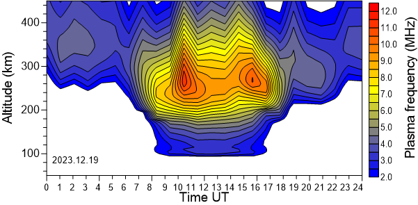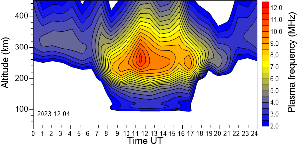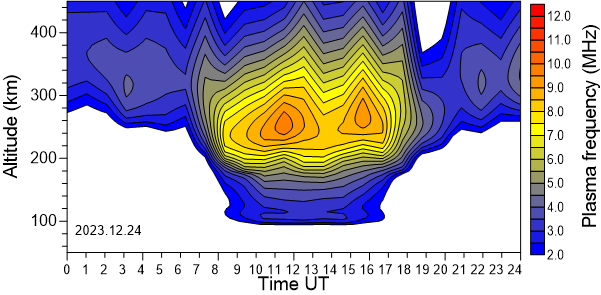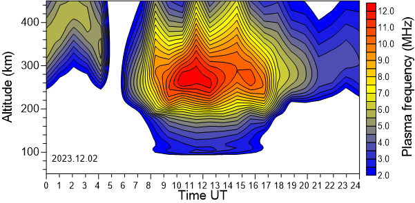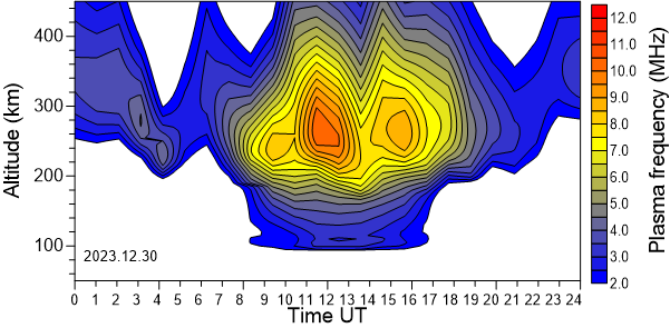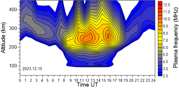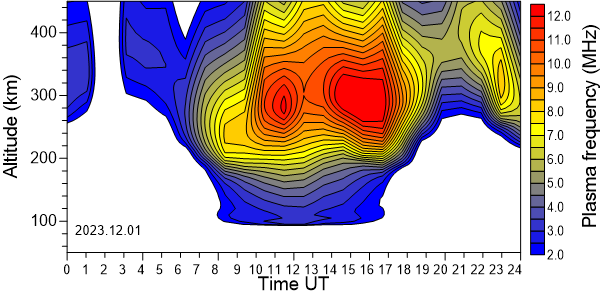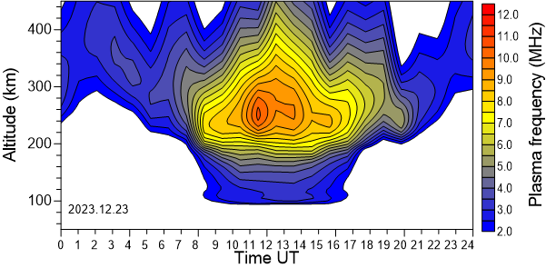 Daily variation of the electron density (Plasma frequency) above the Observatory as function of the altitude for the latest 31 revised days .