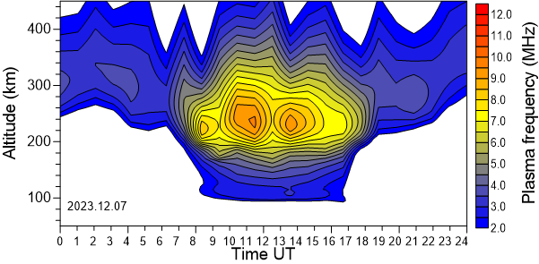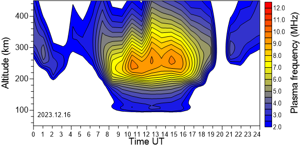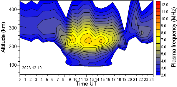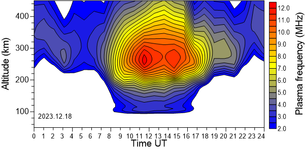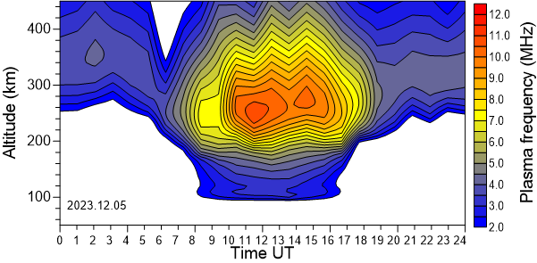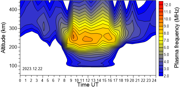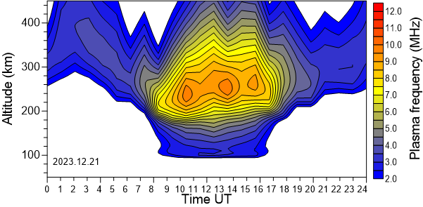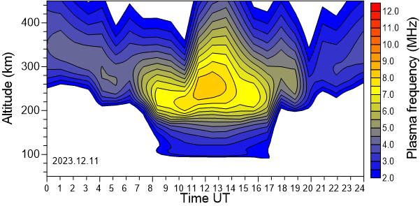Variación diurna de la densidad electrónica (Frecuencia de plasma) sobre el Observatorio en función de la altura de los últimos 31 días revisados.