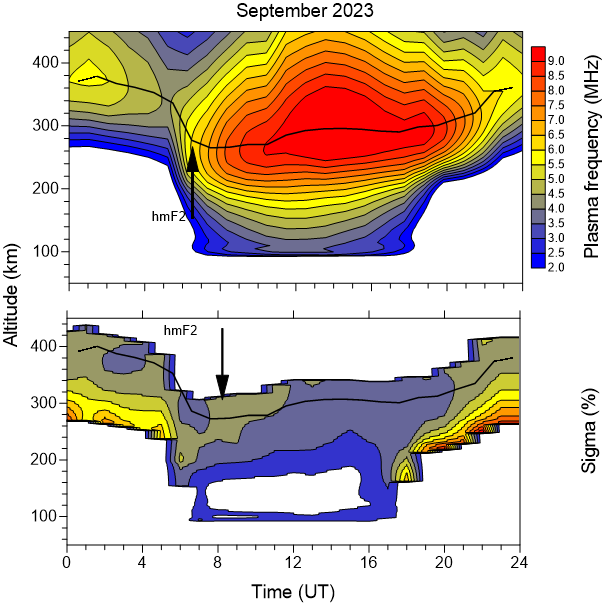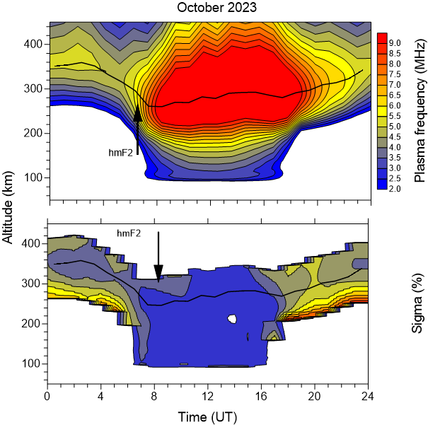 Typical daily variation of the electron density (Plasma frequency) and its standard deviations (%) above the Observatory as function of the altitude for next months.